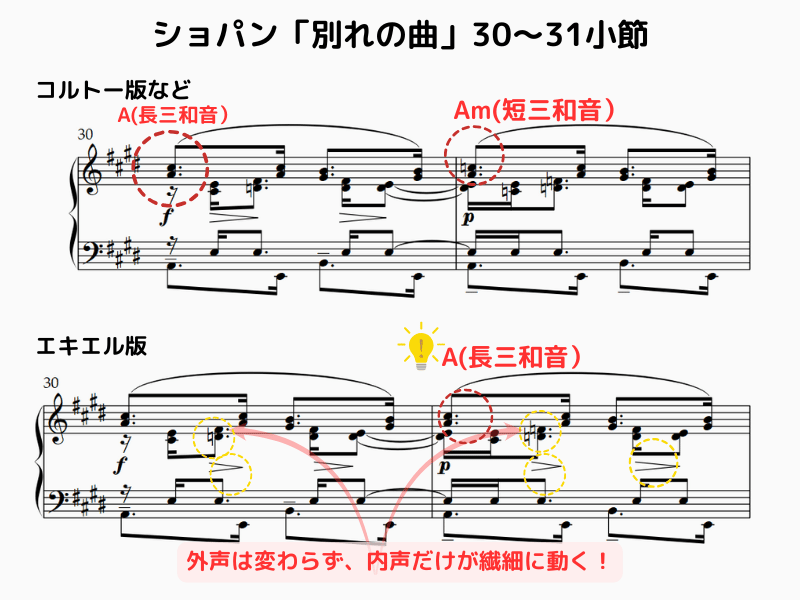 エキエル版は、細かい装飾音、スラーやアクセントの配置、そして和声そのものすら他の版と異なることが少なくありません。
